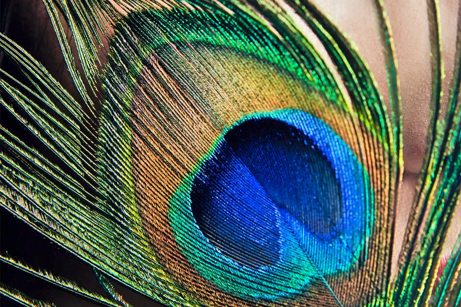 Die Keratinschichten in den Bartfäden der Pfauenfeder haben die perfekte Dicke, um die hellsten Dünnschichtfarben zu erzeugen. Die verschiedenen Farben im Augenmuster sind das Ergebnis kleiner Unterschiede in der Lichtverzögerung und werden durch Veränderungen im Brechungsindex und/oder in der Dicke der Keratinschichten verursacht. Diese tragen zur Brillanz der Farben in der Feder bei, indem sie mehrere Lichtkomponenten hinzufügen.
