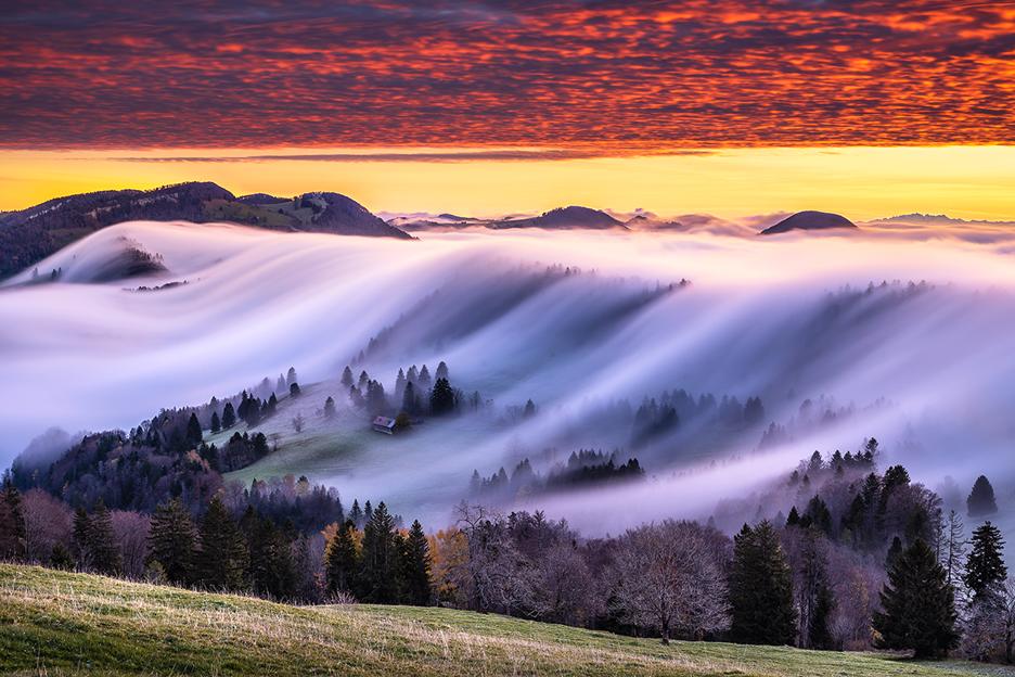 Nebelwellen sind kein alltägliches Phänomen und so habe ich Jahre gewartet, bis der Morgen kam, an dem alles zusammenpasste. Der Nebelfall über den Jurahügeln, der Stand der Sonne, die dichte Wolkendecke, die Weitsicht. Ein Geschenk.